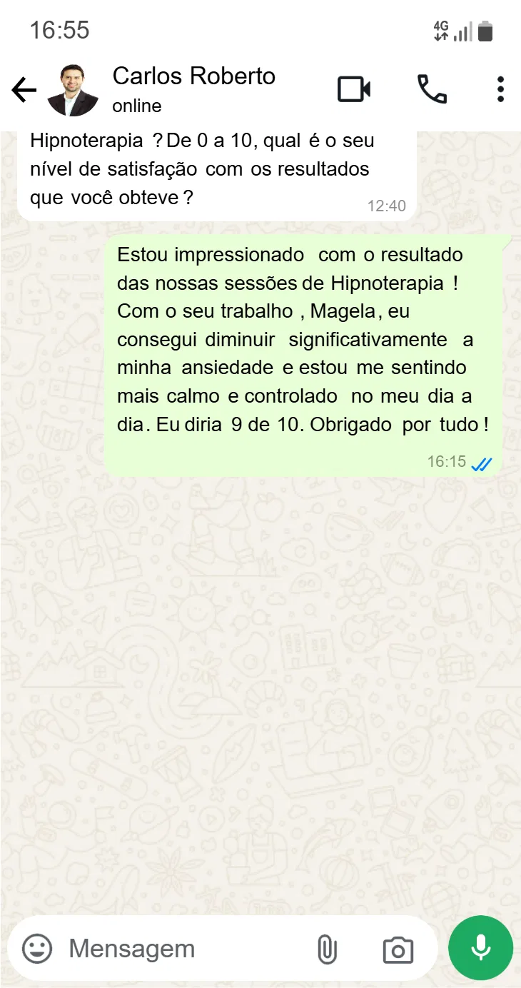 "Eu superei a ansiedade com a hipnoterapia do Magela e agora consigo lidar com situações estressantes de forma mais calma."