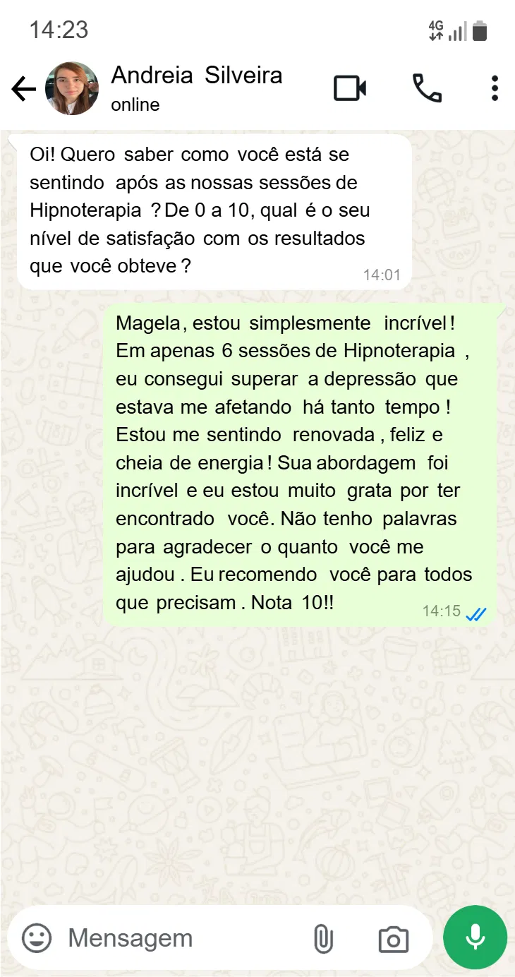"A hipnoterapia do Magela me ajudou a superar a depressão e agora estou mais feliz e confiante."